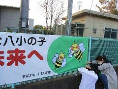 子ども達でデザインの投票をして作成した,「50周年記念横断幕」が完成して,学校に届きました。もちろん「ハッチーと8っぴー」も登場しています。