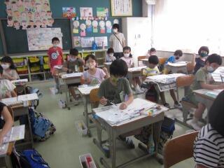 「絵具を使って勉強するよ」というと,「やったー!」と大喜びの1年生。