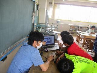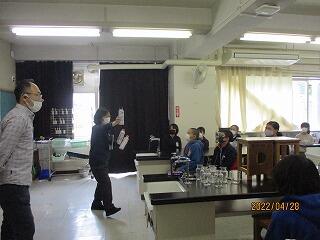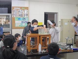 そこで,理科室の中央の机を実験台にして,理科教育支援員の加藤先生が演示実験をしてくださいました。