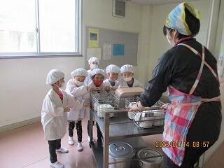 当番さんが身支度をし,ワゴンを配膳室から教室に運び,全員に配膳します。当番さんは1週間ごとに交代です。
