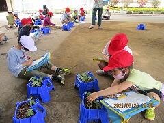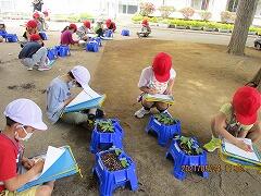 校庭でアサガオの観察にも真剣でした。葉の手触りを確かめたり,茎の色を確認したり,とても丁寧に観察し,記録をしていました。