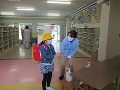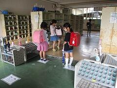 1年生は,お家の方と一緒に登校しましたが,今日は昇降口から一人で教室に向かいます。自分のくつ箱覚えているかな?手の消毒を忘れずにね。
