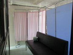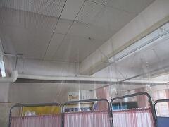 具合が悪い人の待機場所は,天井からのビニールカーテンで囲まれています。