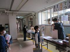 今回は2日間とも曇り空,今にも雨が降りそうなお天気なので,教室・昇降口・体育館に分かれての受け渡しとしました。