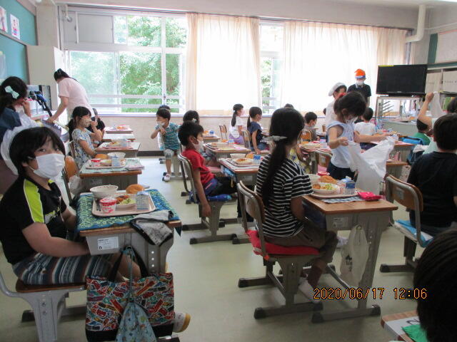 学習や給食の交流も はじまっています。前をむいて 食べますが、みんなといっしょに 食べるだけでも おいしく感じますね。