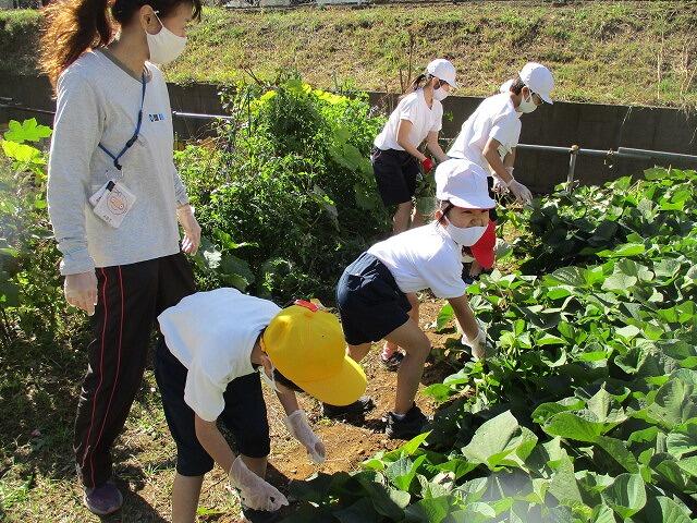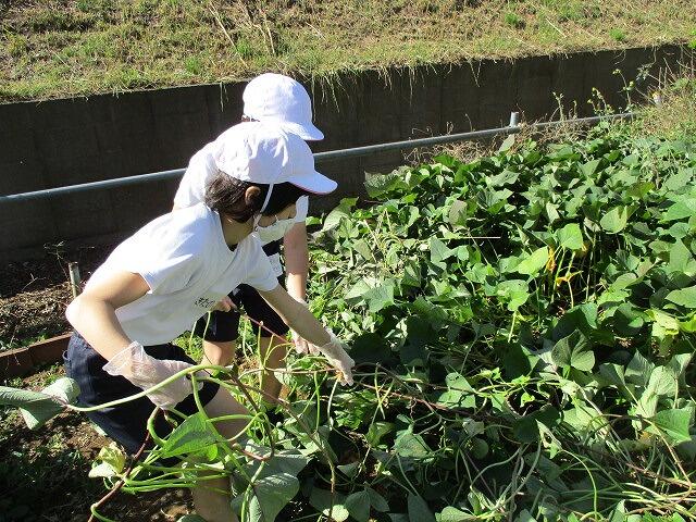 夏に植えたさつまいもを収穫しました。みんなで「うんとこしょ,どっこいしょ」とかけ声をあげながら長いつるを引っ張ると,みんなの顔ぐらい大きなさつまいもがとれました。