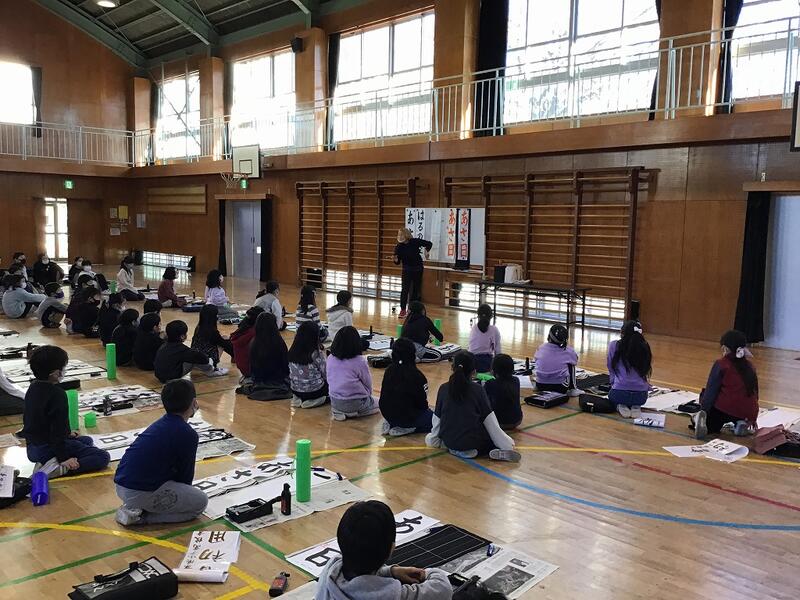 「森文子先生」に体育館で書き初めの指導をしていただきました。