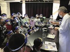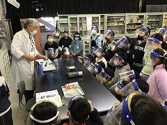 フェースシールドを付けて,城石先生や担任の実験の様子をよく見ています。