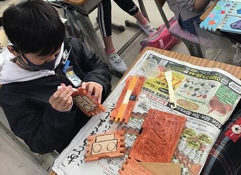 まわりの板を彫刻刀で彫ります。 絵の具で色をつけています。