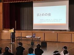 背景に写っているスライドや写真も,学年リーダーが今まで職員が撮った写真の中から選んで作りました。全てを,4年生の学年リーダーが中心になって作りました。操作も4年生が行い,何もかも自分たちで作り上げた「まとめの会」です。