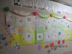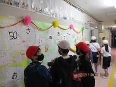 家庭科室前の廊下には,50周年のお祝いメッセージが飾られています。こどもたちや先生たちのメッセージがいっぱいです!さあ,もうすぐお誕生会(式典)です!