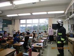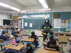 今回はーその1-として,3年生の信夫先生が,お借りした本物の消防服を着て,教室に入っていった時の一コマを紹介します。朝の会に予告なく,消防服を着て入っていった信夫先生。クラスの子どもたちは,最初びっくりして机の下にもぐろうとした子どももいました。信夫先生とわかると歓声が上がりました。