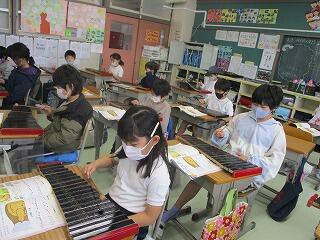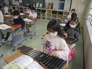 2年生は,音楽の授業で木琴を使っていました。今,飛沫の関係で鍵盤ハーモニカが使えないので,音階を学べる楽器の1つが木琴なんです。ドレミで歌ってから,音階を指で確認。この木琴には黒鍵がありませんが,それでも音階の練習になります。「こぐまの2月」を一生懸命練習していました。金曜日がテストだそうです。がんばって!