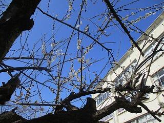 卒業式練習,3日目。雨上がりの今日,体育館前の梅の花が,五分咲きとなりました。