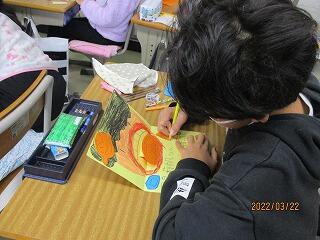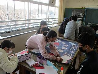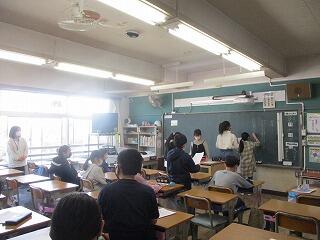 3年生はお世話になった人や友だちへの感謝のカードを仕上げていました。飛び出す絵本になっていてとても素敵です。お隣のクラスでは,「3年生ゴールの会」をしていました。1年間クラスで頑張ってきたことを皆で称え,確認し合って全員でゴールテープをきるという会です。実行委員を中心に生き生きと進行していました。