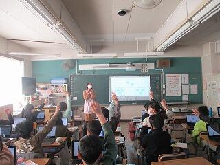 「今日は雨ですが,室内でできる体育をします。」という先生の話に,「やったー!」と歓声が上がりました。歓声と同時に嬉しい気持ちをゼスチャーで表すというオンラインならではの表現方法も身につきました。