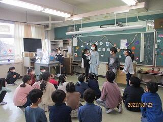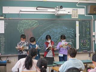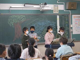 4年生は国語の「木竜うるし」の朗読発表会をしていました。4年で読むところや読み方を工夫し,効果音を入れ素晴らしい出来栄えでした。 令和3年度もあと2日です。