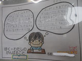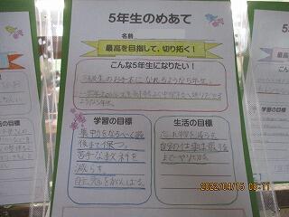 そして,各クラスの廊下には,子どもたち一人一人の「目標」が掲示されています。どんなことを実現させたいのか,なぜそうなりたいのか,実現させるために何に取り組むのか・・・などが書かれています。ご来校の際に,ぜひご覧ください。