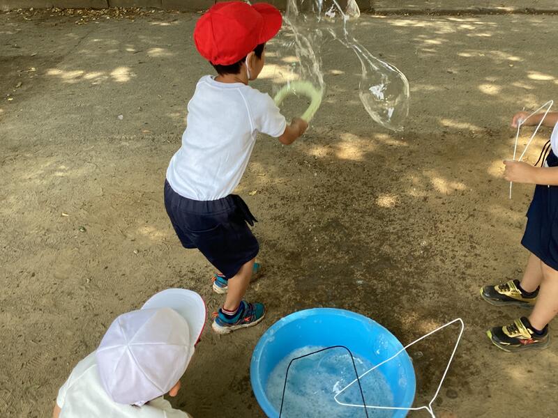 友達と走りながら「しゃぼん玉」をつくる子,思うように作れないと「どうしてすぐにつぶれちゃうのかな」「ゆっくりやると大きくできるんだ!」とコツを発見している子,それぞれ考えながら「しゃぼん玉」を作っていました。