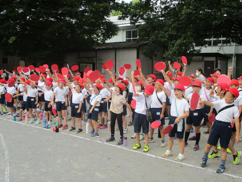 子どもたちの応援テンションを一気に高めようという,体育主任の先生のアイデアです。