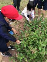「たたき染め」では,ひまわりの畑で育てた藍の葉っぱを使いました。