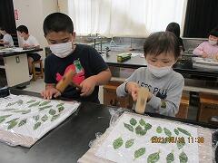 ひまわり学級の子どもたちは,用務員の後藤さんが先生となって,「たたき染め」に挑戦していました。木づちも上手に使っていましたよ。詳しくは,別記事で後ほどお伝えします。