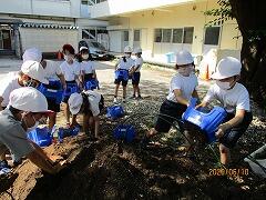 2年生は,1年生の時に植えたチューリップ等の球根を掘り起こし,ミニトマトの苗を植えていました。