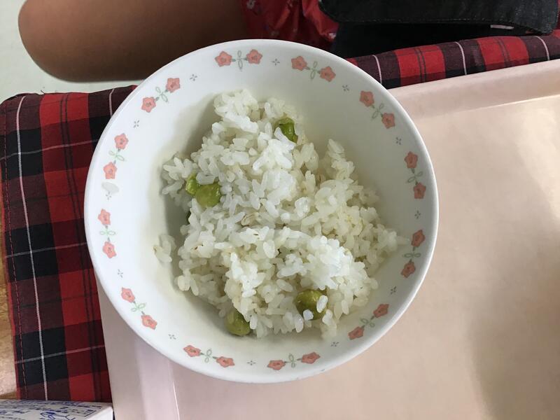 この日のメニューには2年生とひまわり学級の子どもたちがさやむきをしたグリンピースご飯が登場しました。