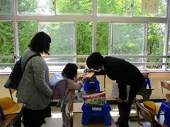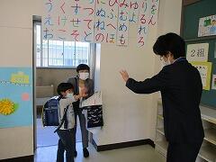 1年生はランドセルを背負い,保護者の方と教室で担任の先生とお話をしました。