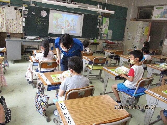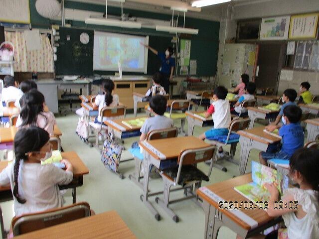 1年生の交流学級でみんなといっしょにコロナに対しての学校生活のことや、国語のひらがな、ぼうさいずきんの使いかた、ならびかた、職員室や保健室など学校の中の探検もしました。