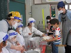 ①当番は,4人。手を念入りに洗い,白衣をつけ,フェイスシールドをつけます。教師も同様です。