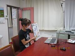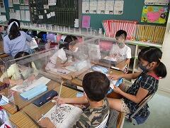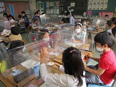 英語ルームでは,マスクを取って飛沫カーテンの内側から発表しました。教室では,聞く側が飛沫防止ガードを設置して発表を聞きました。