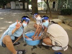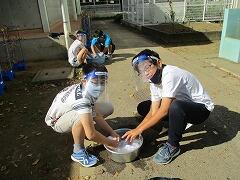 たらいに水を汲んで体操服や上着を手洗いしました。いや~大変。昔はこうして一枚ずつ手洗いしていた時代もあったんだなあ・・と感慨深げでした。