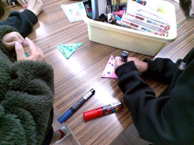 どうやら折り紙で,クリスマスツリーのかざりを作っているようです。