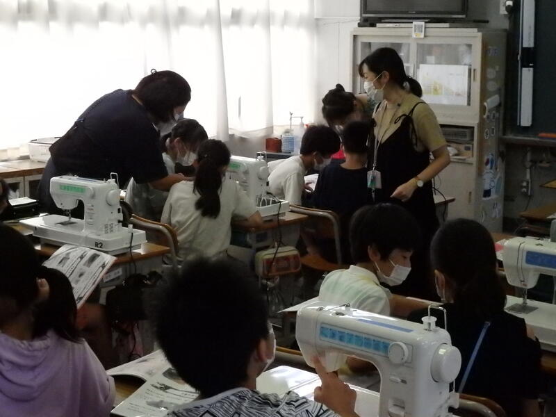 5年生のミシンを使った学習活動では、サポートの保護者の方も入り、効率よく作業を進めていました。