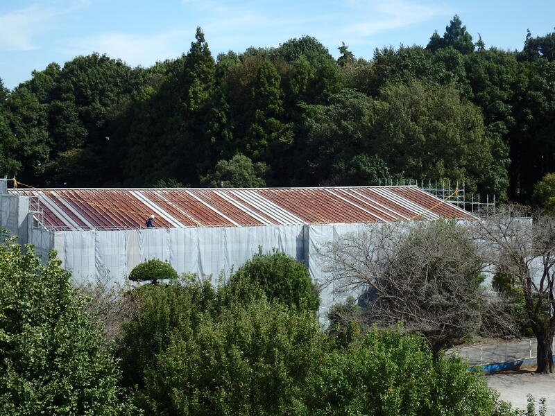 今日の藤心は、秋の空。それでも気温は33度まで上がりました。屋根修繕工事のため、体育館の姿がだんだん見えなくなってきました。このあと夕方にはすべて覆われてしまいました。
