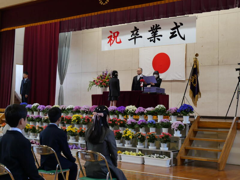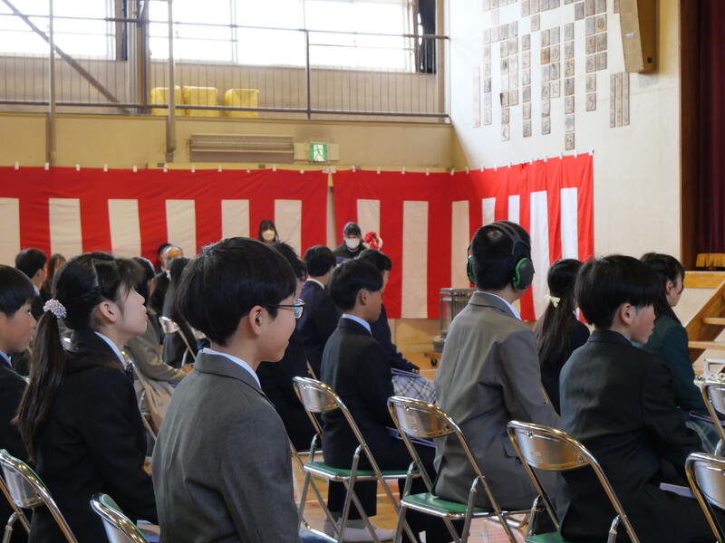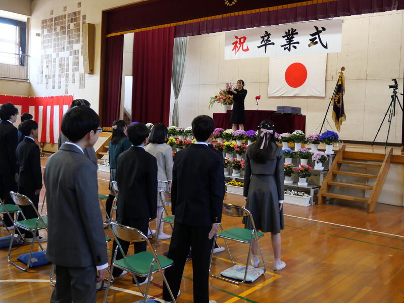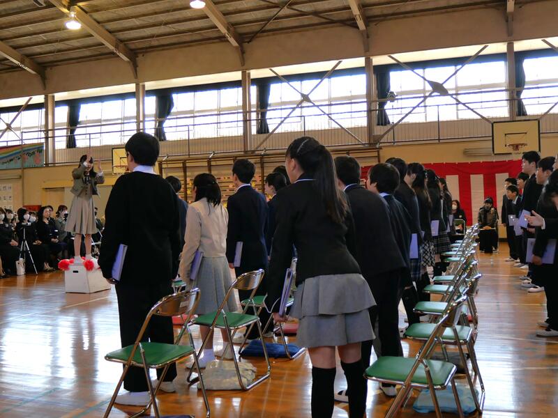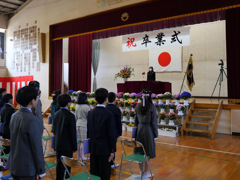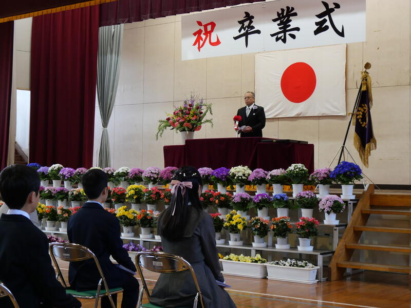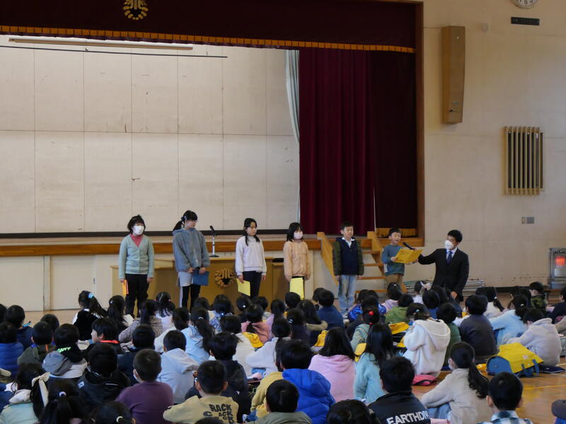 また、頑張ったことやできるようになったことを代表の藤っ子が発表してくれました。生徒指導主任の先生からは、春休みの過ごし方で気をつけてほしいことについてお話がありました。修了式に続いて辞校式。
