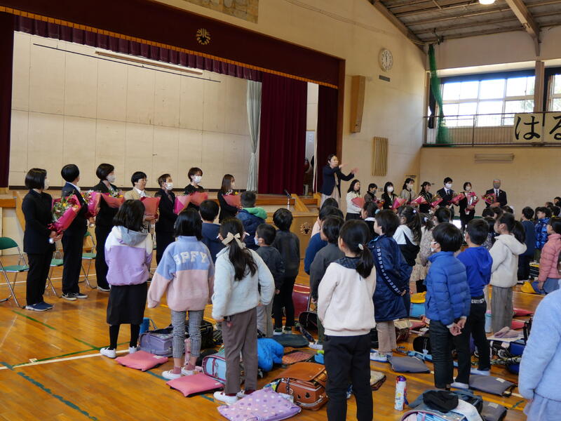 今年度末で異動・退職する教職員は18名。藤心小としては多い感じです。先生たちが一人ずつ話をしました。児童代表の話があり、花束贈呈があり、そして、みんなで校歌を歌い、思いを伝え合いました。藤っ子たちの涙がたくさん光っているのが見えました。