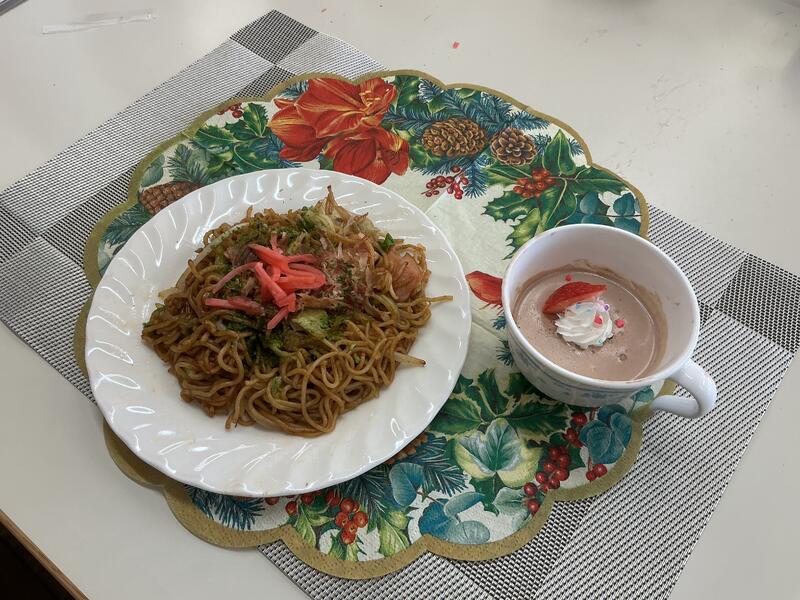 今日のメニューは「焼きそば」と「チョコレートムース」です。