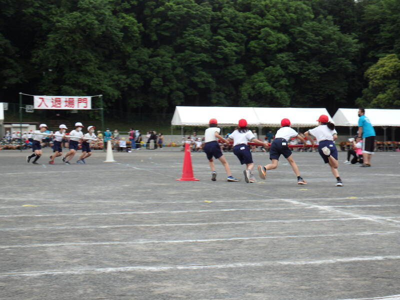 4年生個人種目「クラブってなにやるの?」カードをめくって出たクラブの活動の1コマをレースの中で体験します。今日は風が吹いていたので、卓球のラケットにピンポン球を乗せて走るのは、けっこう難しいと感じましたが、子ども達は、落とさないように慎重にゴールを目指していました。本当のクラブ活動は、何クラブに入るのか楽しみです。