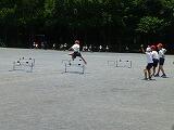 体育は「ハードル走」。リズムよく走っています。友達も横で応援しています。
