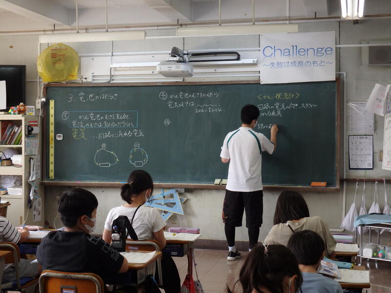 4年生では、「乾電池の向きを変えると、電流の向きは変わるのだろうか」というテーマに対する予想の場面でした。「変わる」と予想した子が多数。「変わらない」と予想した子が少数でした。子ども達は、3年生の既習の内容や生活経験などから、根拠をしっかりともって予想し、発表していました。例えば、「乾電池の向きを変えても、電流の向きが変わらないなら、乾電池にプラスとマイナスがある意味がない」や「豆電球の実験のとき、乾電池の向きを変えても、豆電気は光ったから、電流の向きは変わっていない」など。これから実験して確かめていくのが楽しみです。