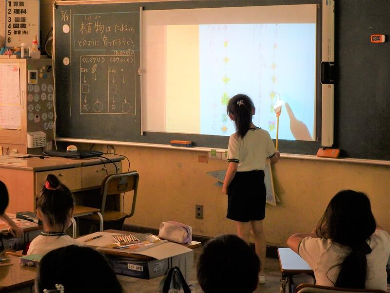 予想の発表は、拡大投影機を使って、予想の絵をもとに順序立てて説明していきます。所々で先生もフォローをしっかりしてくれていたので、安心して発表していました。