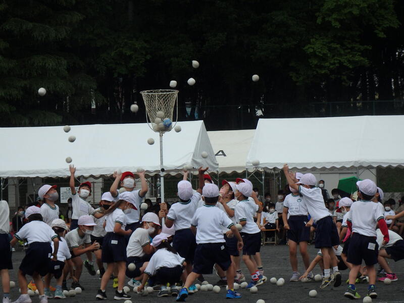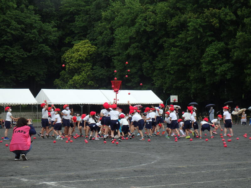雨が弱まるのを待ったあと、1年生・2年生の「ダンシング玉入れ」ですが、雨は降り続いています。子ども達は、ダンスに真剣、ネットに玉を入れるのに真剣、そして、結果はなんと1つの差という、激戦でした。