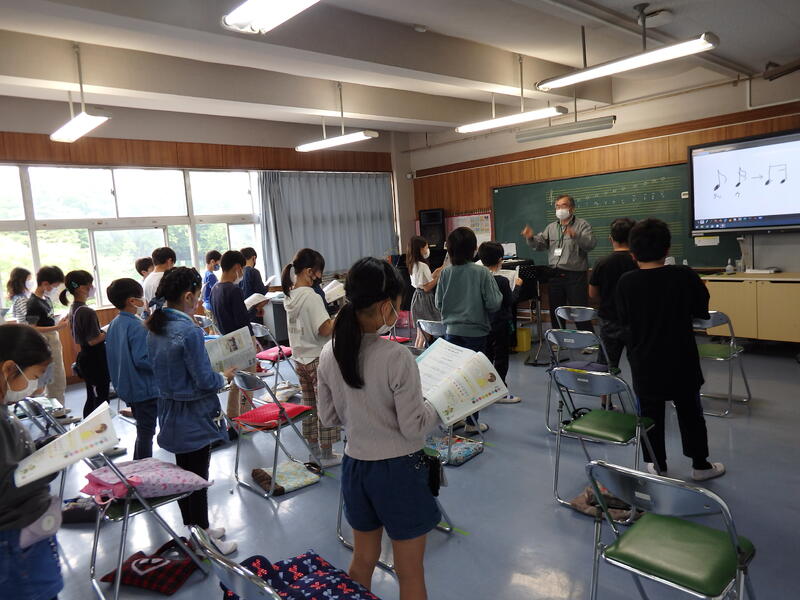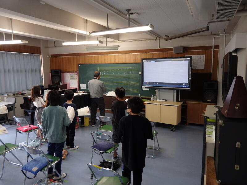 本来なら、音の高さやリズムに気をつけ、曲想を感じ取って歌いたいところですが、感染予防対策として、換気はもちろん、全員前向き、座席の間隔確保、マスク着用、ハミングで表現していました。ハミングは、歌詞で歌うときに比べ、表現が意外と難しいと感じましたが、みんな真剣でした。先生も鍵盤ハーモニカを使う際には、子ども達と向き合わず背中を向けて演奏していました。