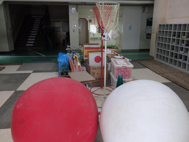 各種目の練習では、順番を確認したり、コースを確認したり、道具・用具を確認したり、注意することを確認したり、本番に向けて頑張っています。昇降口にも用具が集まり始めました。