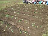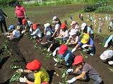 爽やかな風が吹く青空の下,2年生がさつまいもの苗植えをしました。