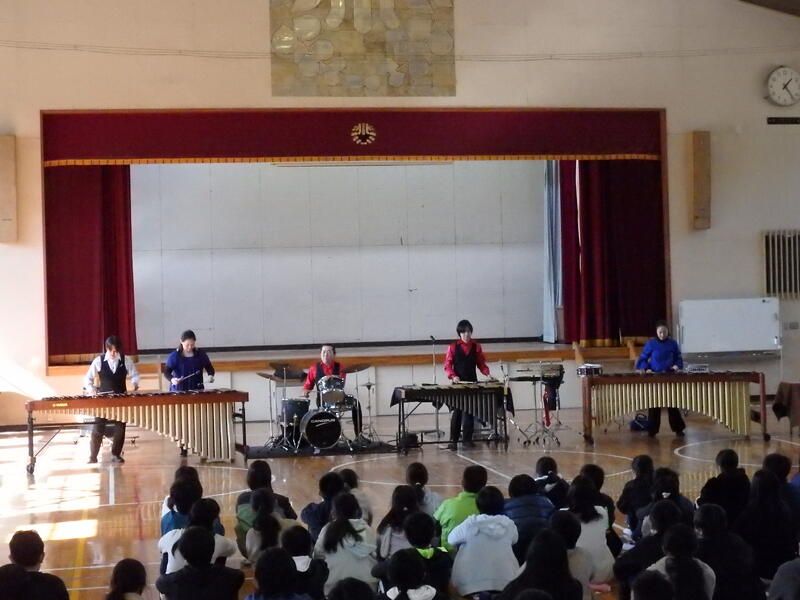 2月9日の木曜日、令和4年度の「芸術鑑賞教室」を実施しました。打楽器のみで素敵な演奏、楽しい演奏を披露してくださったのは「打ax(ダックス)」の皆様です。演奏だけではなく、子ども達を楽しませてくれる演出も素晴らしく、子ども達は「楽しい音の世界」に引き込まれていました。また、使用する打楽器の紹介やボディパーカッションを体験する場面もあり、全身で音楽を体感できました。