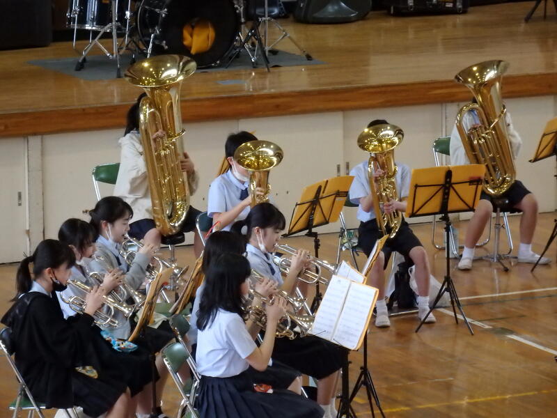延期になっていたブラスバンド部の今年度の活動の集大成「さよならコンサート」を実施しました。コロナ禍での部活動、練習スタート時には、感染予防対策によって様々な制限があり、思うように練習は進まず苦労や我慢をしてきました。パートごとにいろいろな場所で練習、時には廊下でということもありました。