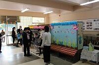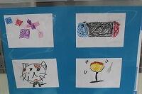 6年生が図画工作で自分の作品をプレゼンしています。1年生は初めての給食でした。